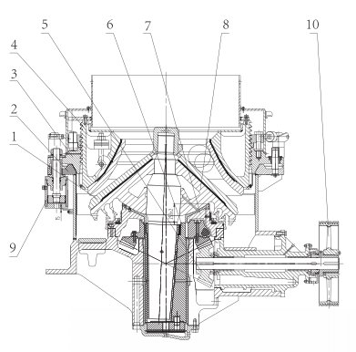 1.衬板部 2.机架部 3.支撑套部 4.调整套部 5.传动部 6.偏心套部 7.碗型轴承部 8.破碎圆锥部 9.液压缸部 10.主机带轮